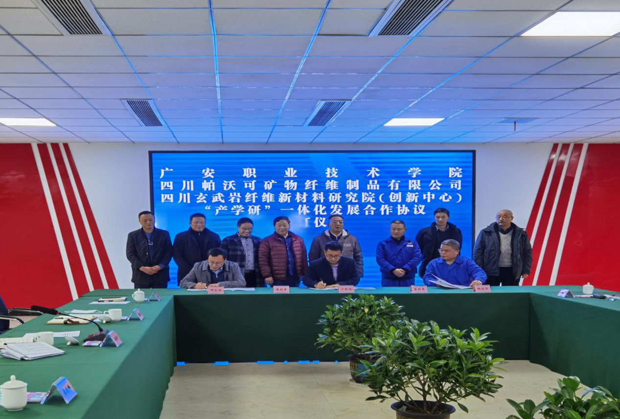 1月25日下午,学校与四川帕沃可矿物纤维制品有限公司、四川玄武岩纤维新材料研究院(创新中心)”产学研“一体化发展合作协议签订仪式在华蓥市帕沃可公司六楼会议室成功举行,学校党委书记王建平主持会议并发表讲话,学校党委副书记、校长王义全,党委委员、副校长张晓峰、邓廷奎,校长助理李晓强,四川帕沃可矿物纤维有限公司董事长刘毅烽,四川玄武岩纤维新材料研究院副院长杨中甲出席会议。