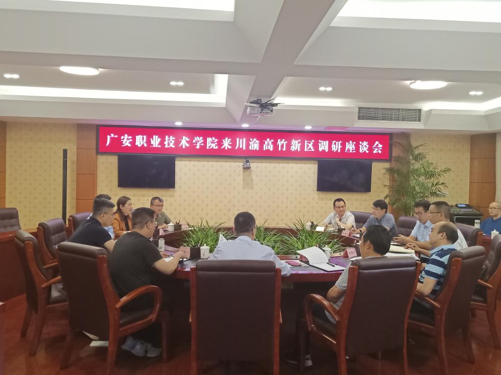 在交流座谈会上,川渝高竹新区综合事务中心主任赵冬详细介绍了新区区位优势、发展思路、功能布局以及管理架构等有关情况。在听取相关介绍后,王义全指出,川渝高竹新区发展速度快,质量高,对新区建成全国有代表性的经济区与行政区适度分离改革试验区、成渝地区产城景融合发展示范区和重庆中心城区卫星城充满信心。王义全表示,广安职业技术学院作为广安唯一高校,专业布局与产业发展高度契合,要紧抓成渝地区双城经济圈建设契机,主动融入川渝高竹新区发展,努力提升服务能力,为新区高质量发展作出贡献。双方还就产业工人培训、学生实习实训和技术服务等合作项目进行了深入交流,并达成了初步共识。