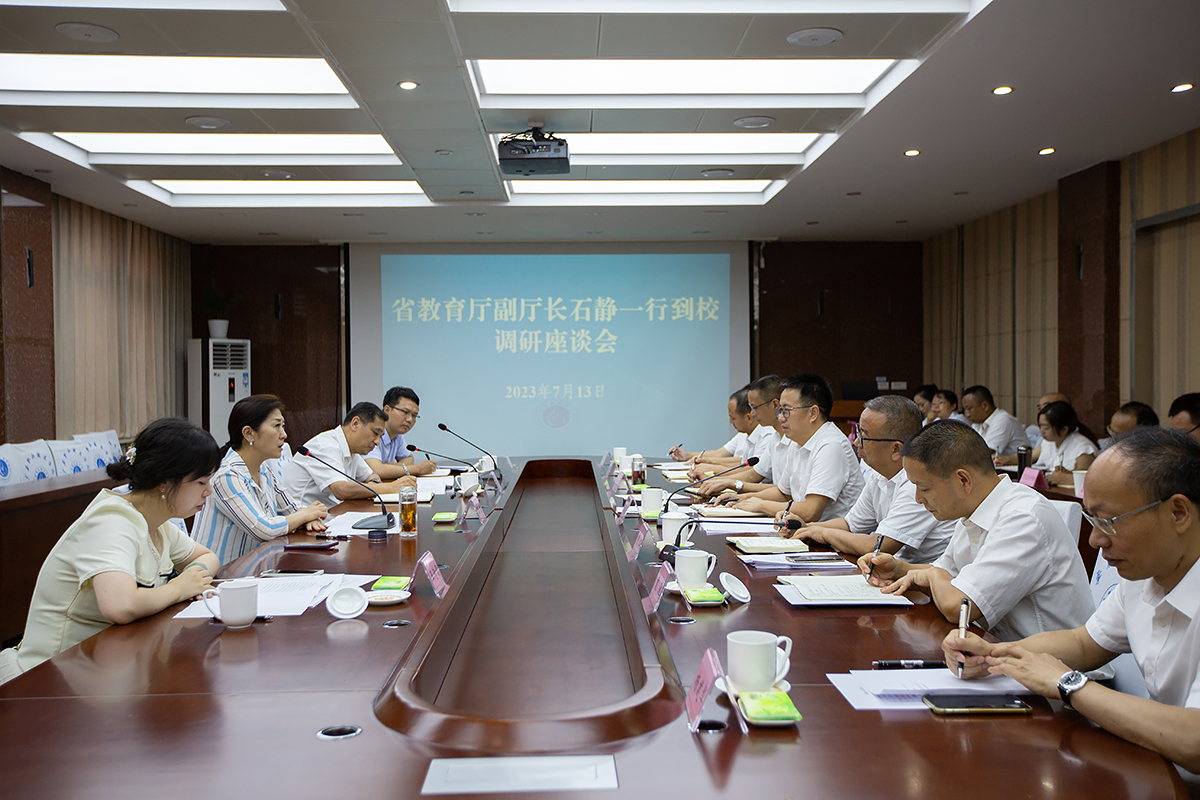 7月13日下午,省委教育工委委员、教育厅党组成员、副厅长石静一行到学校调研办学情况,与广安市教育和体育局、学校班子进行座谈,座谈会由教育厅职业教育处处长孙锐主持。